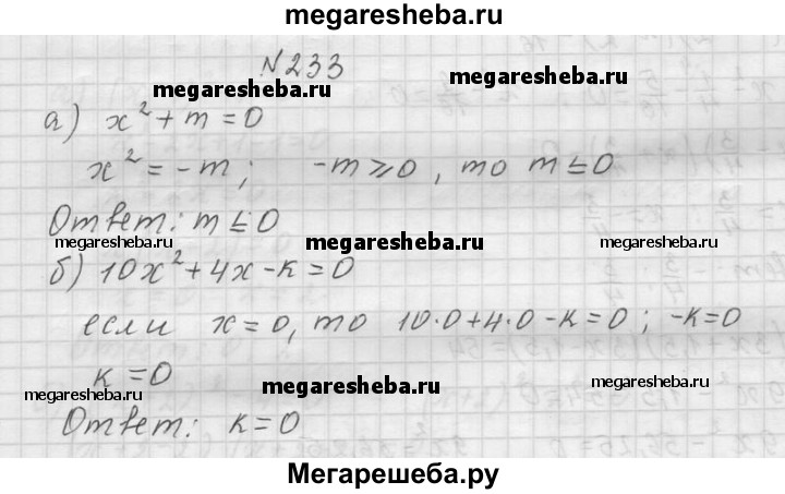 233. а) При каких числовых значениях т существуют корни уравнения х2 + m = 0? б) При каком числовом значении k уравнение 10х2 + 4х - k = 0 имеет корень 0?