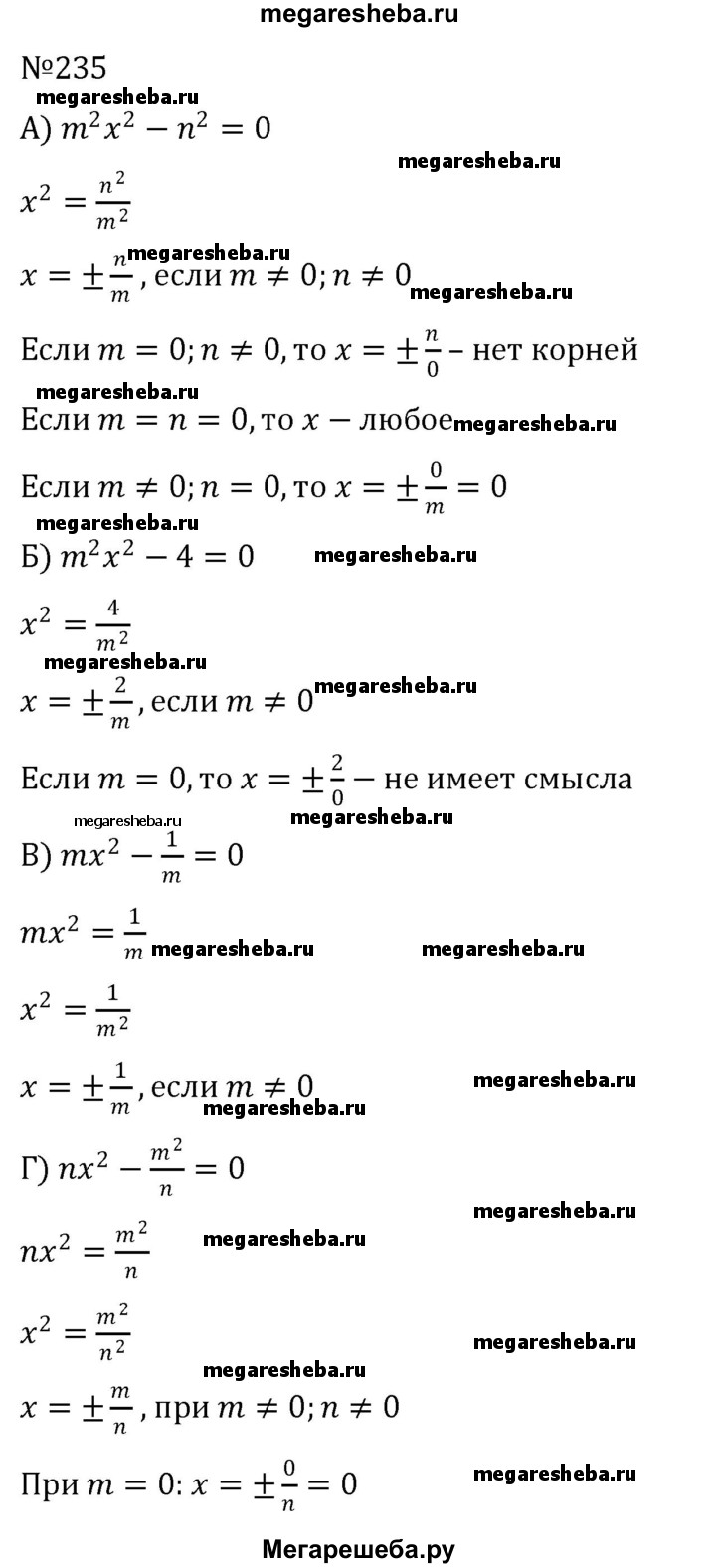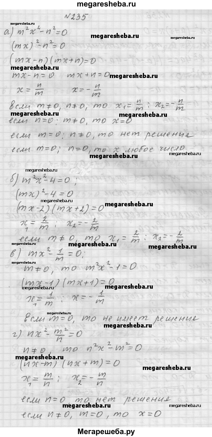 235. Решите уравнение относительно х (m и n — данные числа): а) m2х2 - n2 = 0; б) m2х2 -4 = 0; в) mх2 – 1/m = 0; г) nх2 – m2/n = 0.