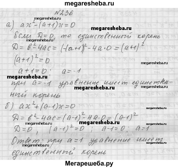 236. Найдите все значения а, при каждом из которых уравнение: а) ах2 - (а + 1)х = 0; б) ах2 + (а - 1)х = 0 имеет единственный корень.