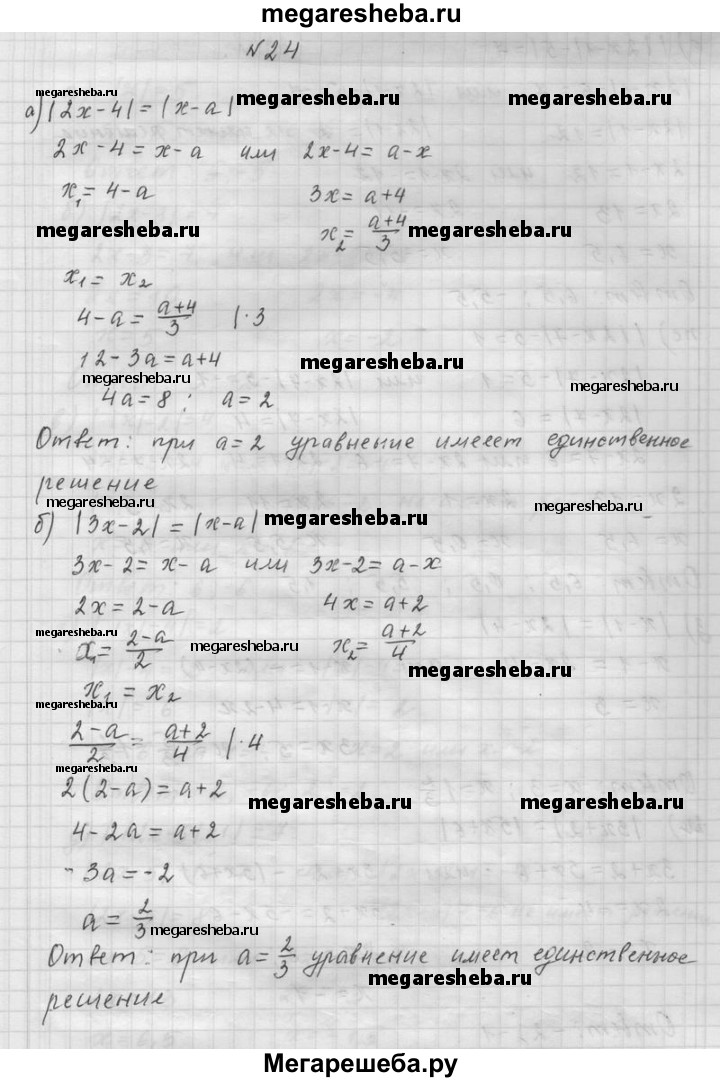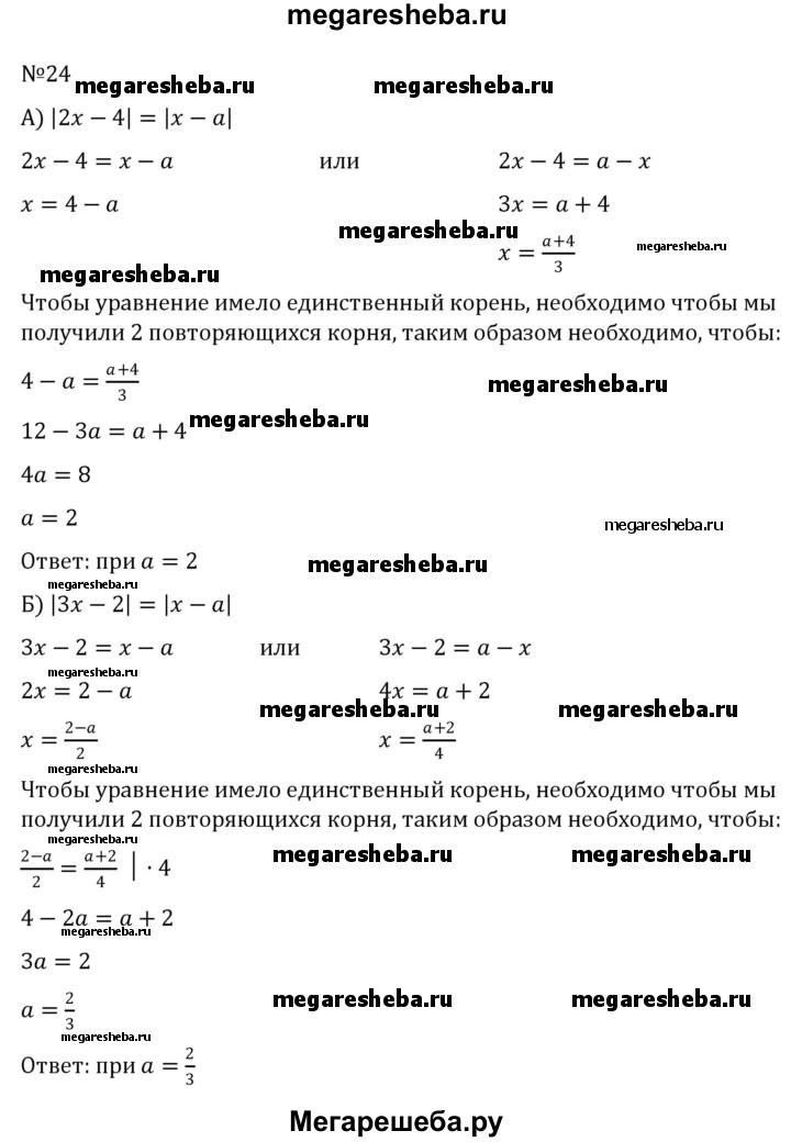 24. Исследуем. Найдите значение а, при котором уравнение: а) |2x - 4| = |x – а|; б) |3x - 2| = |x – а| имеет единственный корень.