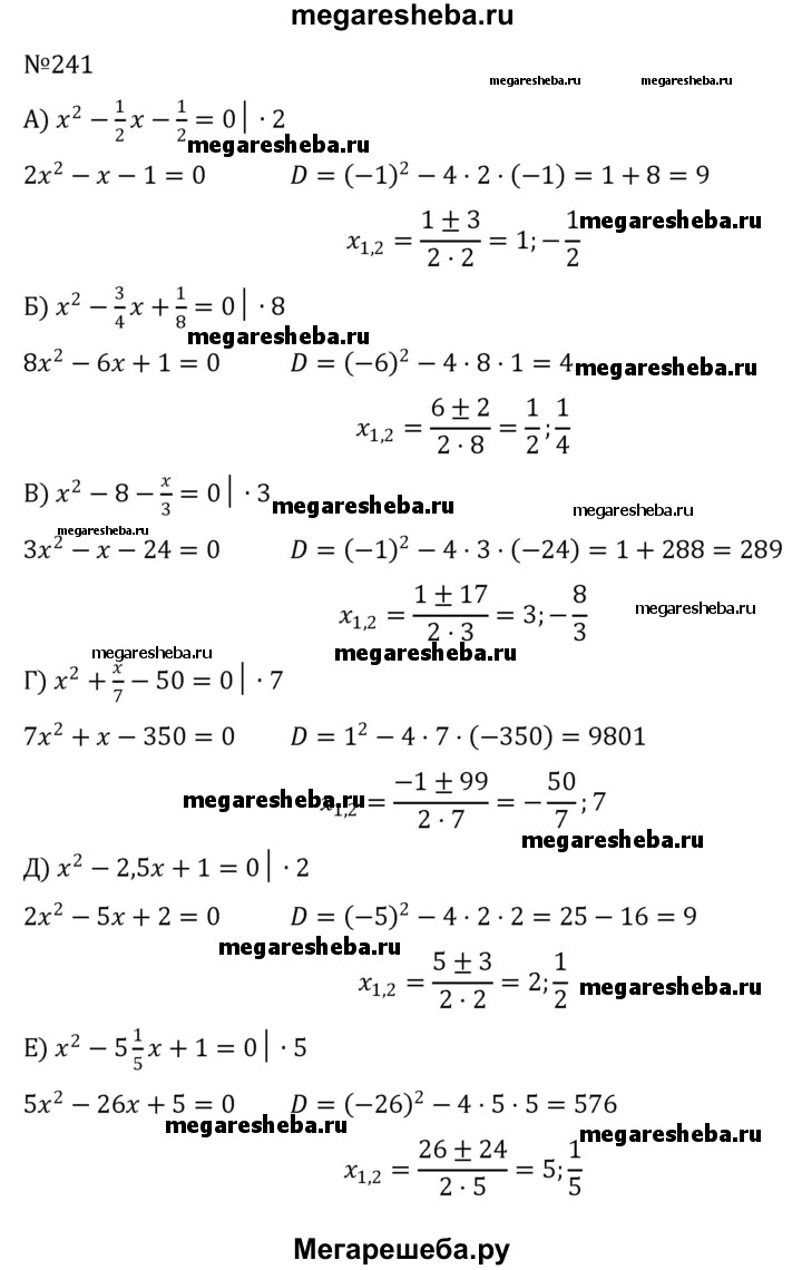 241. Решите уравнение, предварительно приведя коэффициенты уравнения к целочисленному виду, умножив левую и правую части уравнения на одно и то же число: