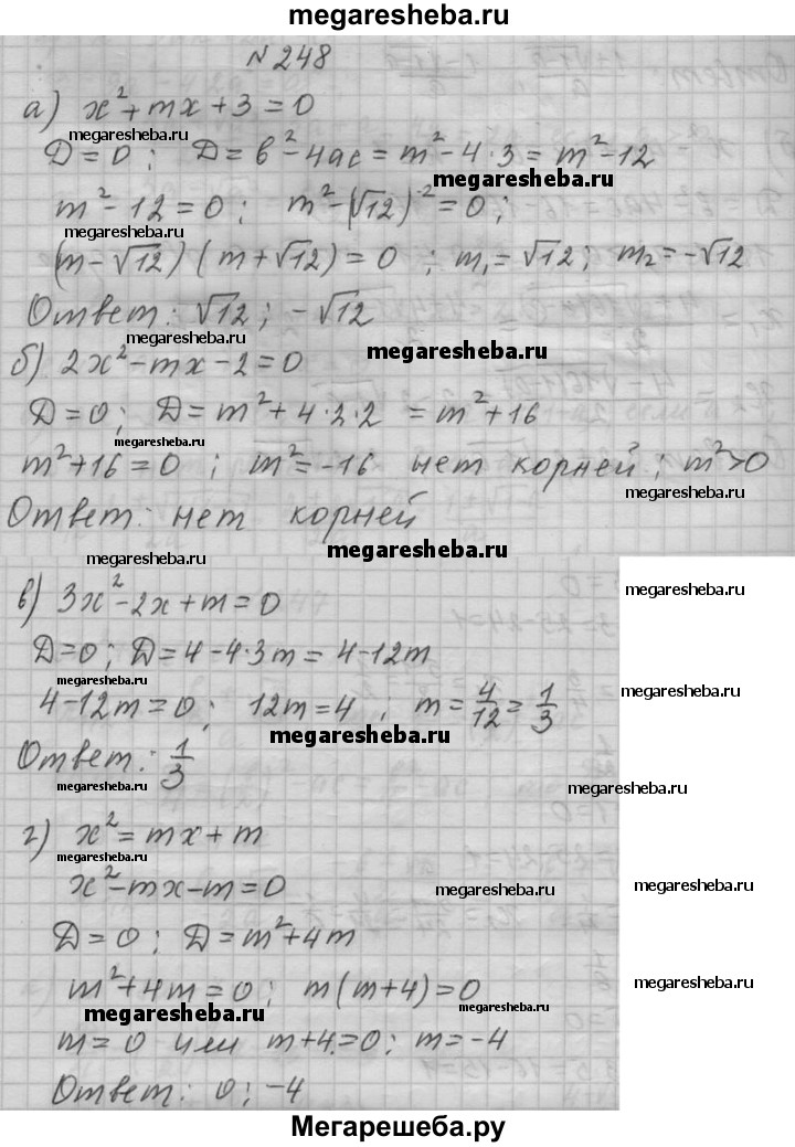 248. Найдите все значения m, при каждом из которых уравнение: а) х2 + mх + 3 = 0; б) 2х2 - mх - 2 = 0; в) Зх2 - 2х + m = 0; г) х2 = mх + m имеет два совпадающих корня.