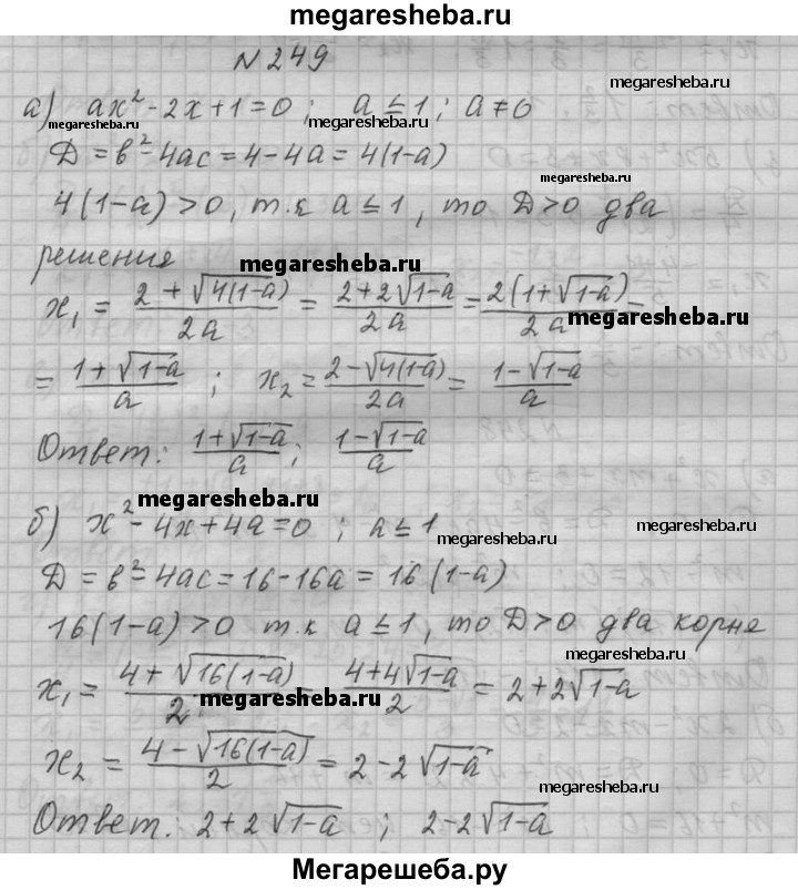 249. Решите уравнение: а) ах2 - 2х + 1 = 0, если число а таково, что а ≥ 1 и а ≠ 0; б) х2 - 4х + 4а = 0, если число а таково, что а ≥ 1.