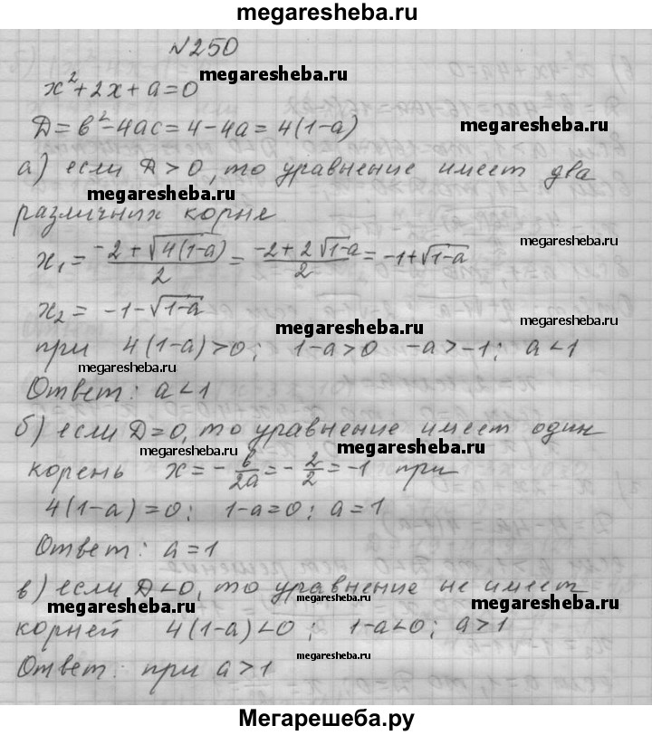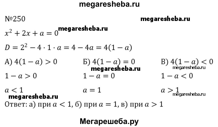 250. При каких значениях а уравнение х2 + 2х + а = 0: а) имеет два различных корня; б) имеет единственный корень; в) не имеет корней?