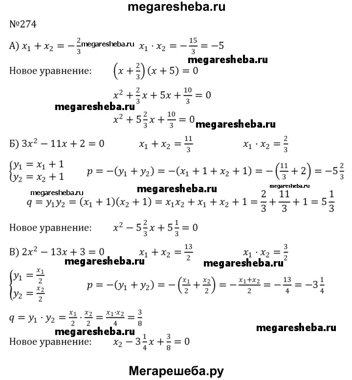 274. Составьте квадратное уравнение, корни которого: а) равны соответственно сумме и произведению корней уравнения Зx2 + 2x - 15 = 0; б) больше корней уравнения Зx2 – 11x + 2 = 0 на единицу; в) меньше корней уравнения 2х2 – 13x + 3 = 0 в два раза.