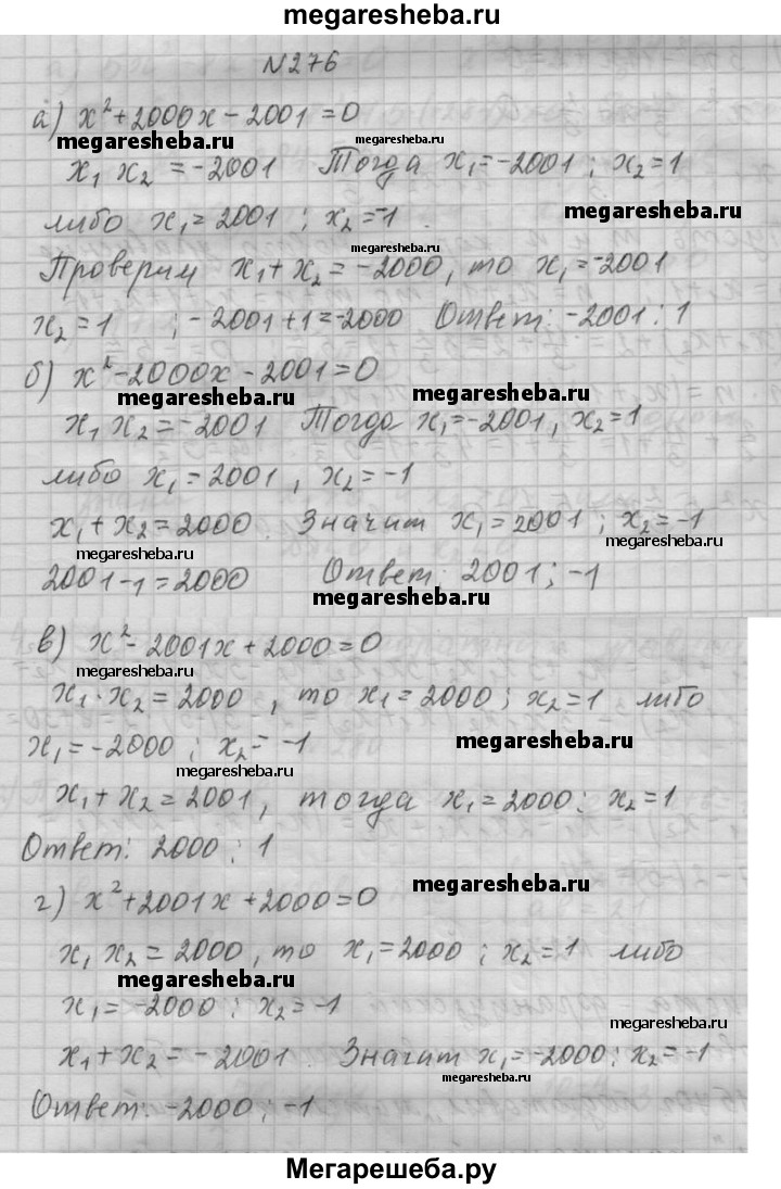 276. Решите устно квадратное уравнение: а) х2 + 2000x - 2001 = 0; б) x2 – 2000x - 2001 = 0; в) x2 – 2001x + 2000 = 0; г) x2 + 2001x + 2000 = 0.
