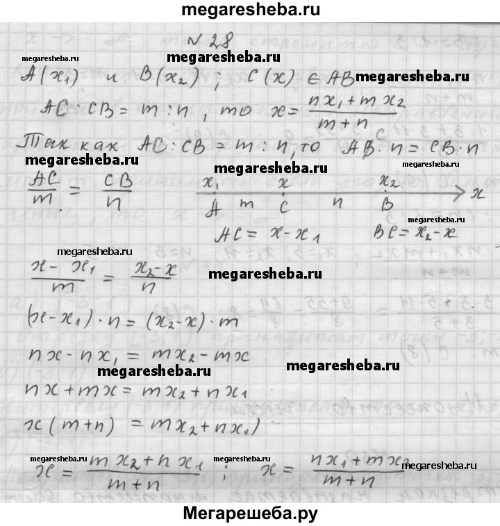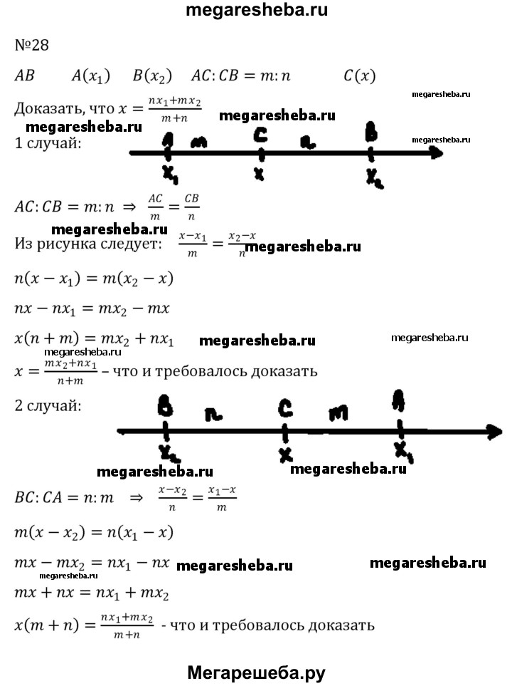 28. Докажите, что если точка С(х) принадлежит отрезку АВ, где А(х1) и В(х2), и делит этот отрезок в отношении АС : СВ = m : n, то координата точки С вычисляется по формуле x = nx1 + mx2 / m+n