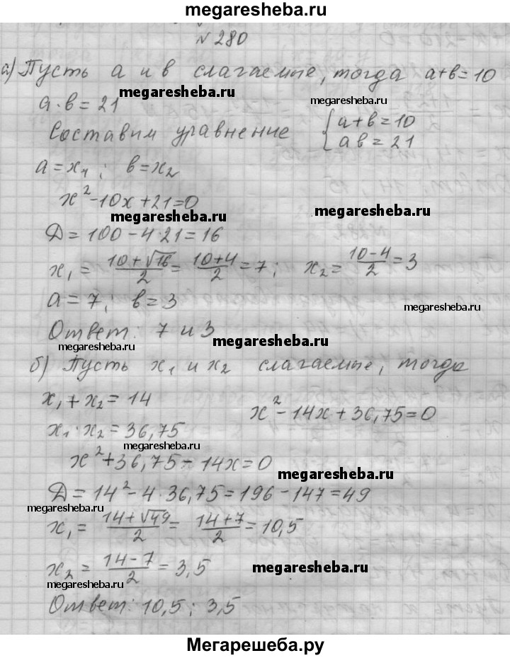 280. а) Разложите число 10 на два слагаемых так, чтобы произведение этих слагаемых было равно 21. б) Разложите число 14 на два слагаемых так, чтобы произведение этих слагаемых было равно 36,75.