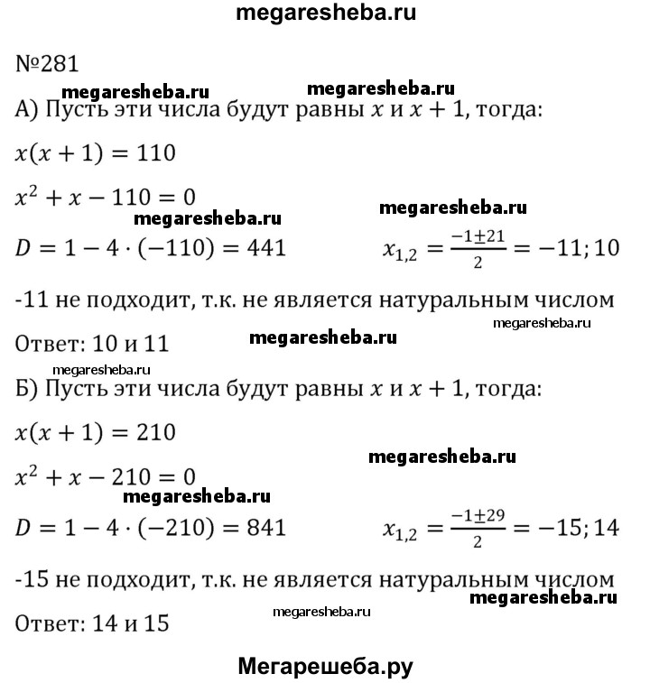 281. а) Произведение двух последовательных натуральных чисел равно 110. Найдите эти числа. б) Произведение двух последовательных натуральных чисел равно 210. Найдите эти числа.