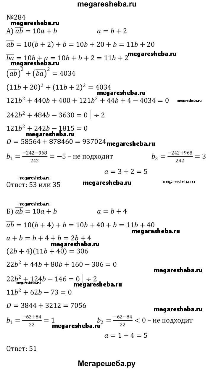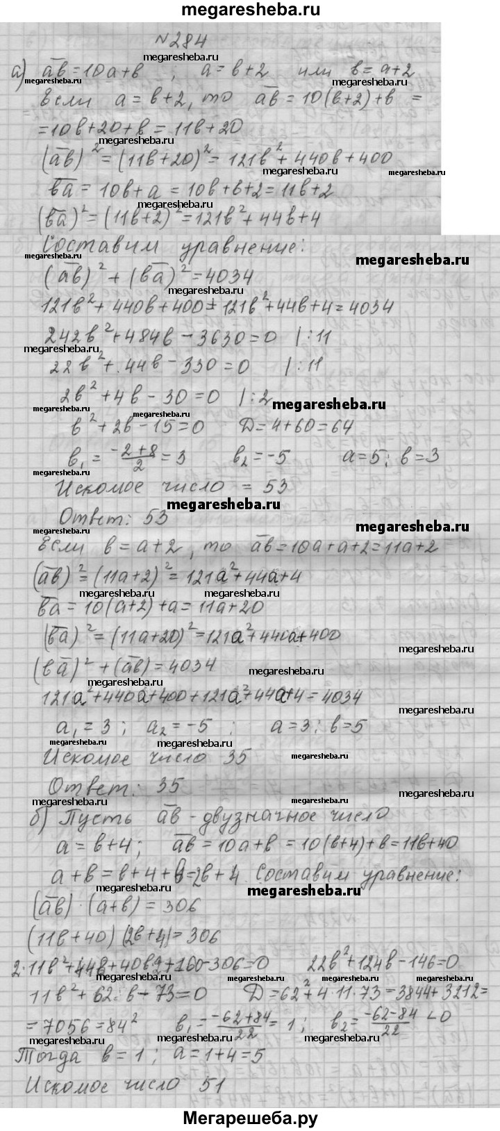 284. а) Одна из цифр двузначного числа на 2 больше другой, а сумма квадратов этого числа и числа, полученного от перестановки его цифр, равна 4034. Найдите это число. б) Найдите двузначное число, если цифра единиц этого числа на 4 меньше цифры его десятков и произведение числа на сумму его цифр равно 306.