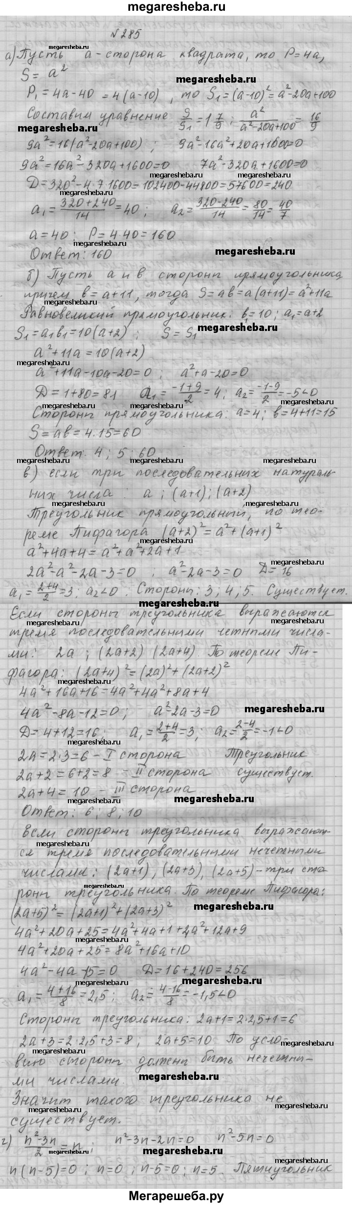 285. а) Если периметр квадрата уменьшить на 40, то его площадь уменьшится в 1*7/9 раза. Определите периметр первоначального квадрата. б) Прямоугольник, одна сторона которого на 11м больше другой, преобразован в равновеликий (т. е. имеющий такую же площадь) прямоугольник, у которого большая сторона стала равной 10 м, а меньшая сторона увеличилась на 2 м. Определите площадь и стороны прямоугольника. в) Возможен ли такой прямоугольный треугольник, стороны которого выражаются тремя последовательными натуральными числами? тремя последовательными чётными числами? тремя последовательными нечётными числами? г) В каком выпуклом многоугольнике число сторон равно числу его диагоналей?