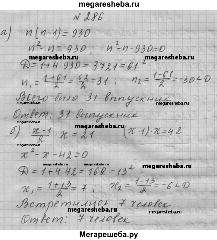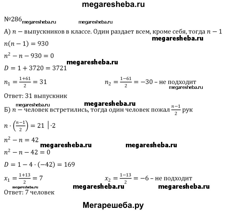 286. а) Выпускники одного класса решили после окончания школы обменяться фотографиями — каждый с каждым. Сколько выпускников было в классе, если всего было роздано 930 фотографий?? б) Несколько человек при встрече приветствовали друг друга рукопожатиями. Сколько человек встретились, если всего рукопожатий было 21?