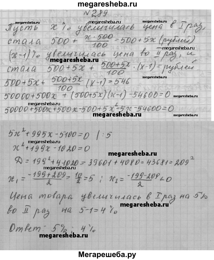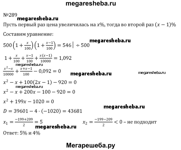 289. Цена товара составляла 500 р. После двух повышений цены товар стоил 546 р. Известно, что во второй раз цена увеличилась на число процентов, меньшее на 1, чем в первый раз. На сколько процентов увеличилась цена в первый раз? во второй раз?