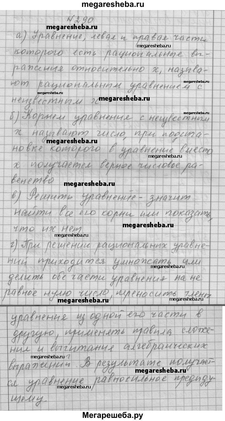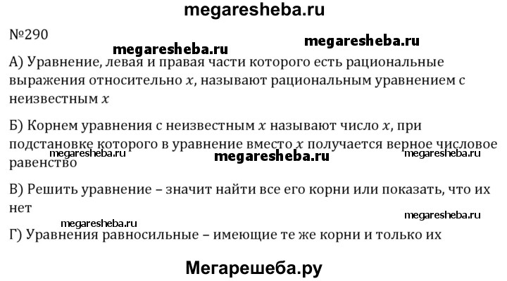 290. а) Какое уравнение называют рациональным с неизвестным х? б) Что называют корнем уравнения с неизвестным х? в) Что значит решить уравнение? г) Какие уравнения называют равносильными?