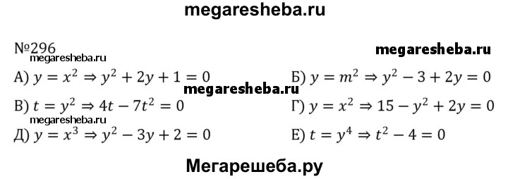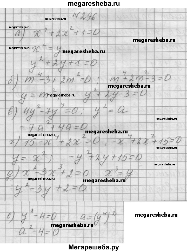 296. Какую замену неизвестного необходимо выполнить, чтобы уравнение стало квадратным: а) х4 + 2х2 +1 = 0; б) m4 - 3 + 2m2 = 0; в) 4у2 - 7у4 = 0; г) 15 - х4 + 2х2 = 0; д) х6 - Зх3 + 2 = 0; е) у8 - 4 = 0?