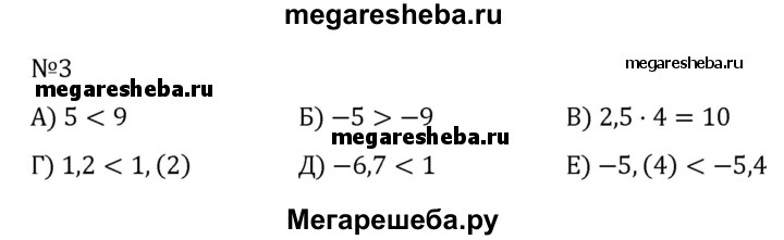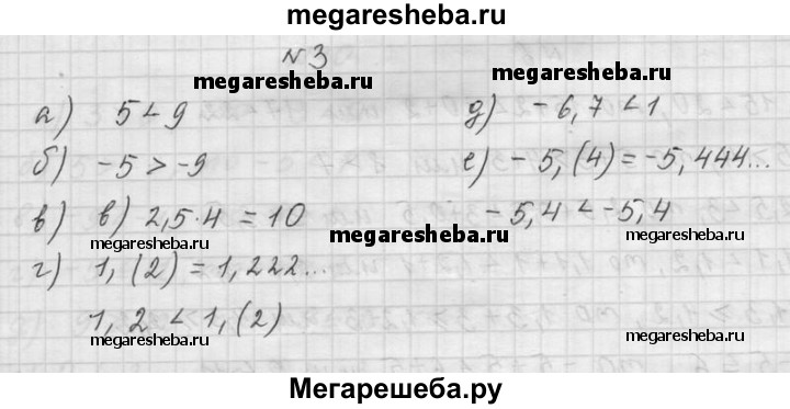 3. Сравните: а) 5 и 9; б) -5 и -9; в) 2,5 * 4 и 10; г) 1,2 и 1,(2); д) -6,7 и 1; е) -5,(4) и -5,4.
