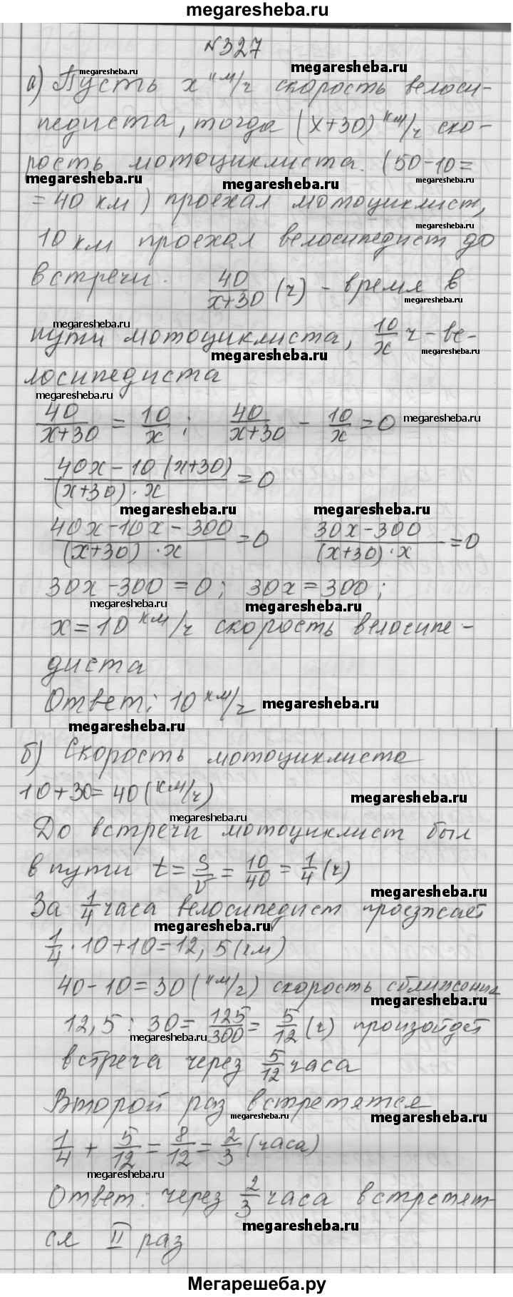327. а) Расстояние между двумя населёнными пунктами 50 км. Из этих пунктов одновременно навстречу друг другу выехали мотоциклист и велосипедист. Скорость мотоциклиста на 30 км/ч больше скорости велосипедиста. Встретились они на расстоянии 10 км от одного из населённых пунктов. Какова скорость велосипедиста? б) Используя условие и решение предыдущей задачи, определите, через сколько минут после встречи мотоциклист догонит велосипедиста, если они продолжат движение после встречи и мотоциклист, доехав до населённого пункта, развернётся и сразу же поедет в обратном направлении.