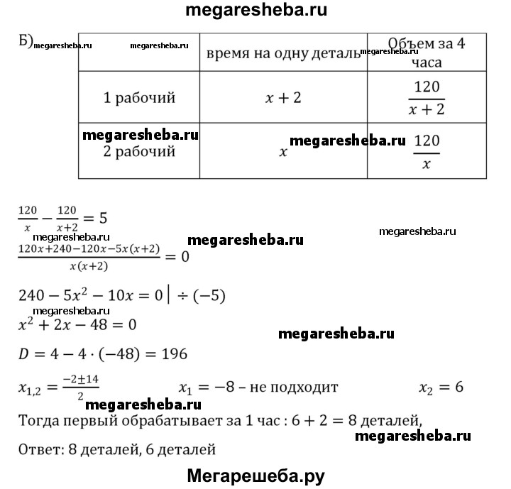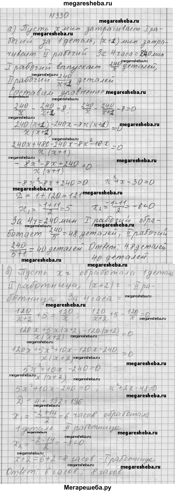 330. а) На обработку одной детали первый рабочий затрачивает на 1 мин меньше, чем второй. Сколько деталей обработает каждый из них за 4 ч, если первый рабочий обрабатывает за это время на 8 деталей больше, чем второй? б) Две работницы должны были обработать по 120 деталей за определённое время. Одна из них выполнила задание на 5 ч раньше, так как в час она обрабатывала на 2 детали больше другой. Сколько деталей в час обрабатывала каждая работница?