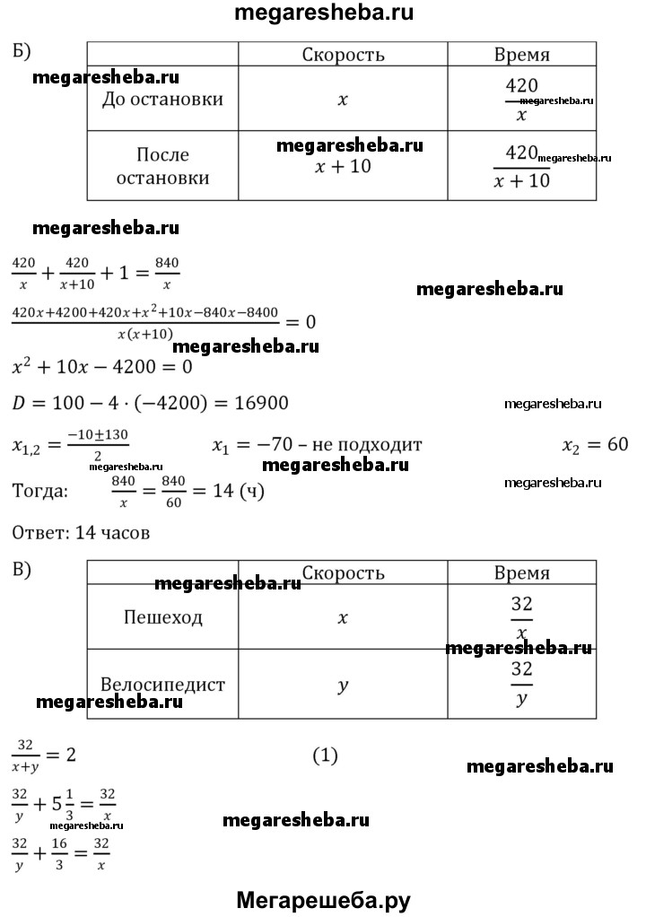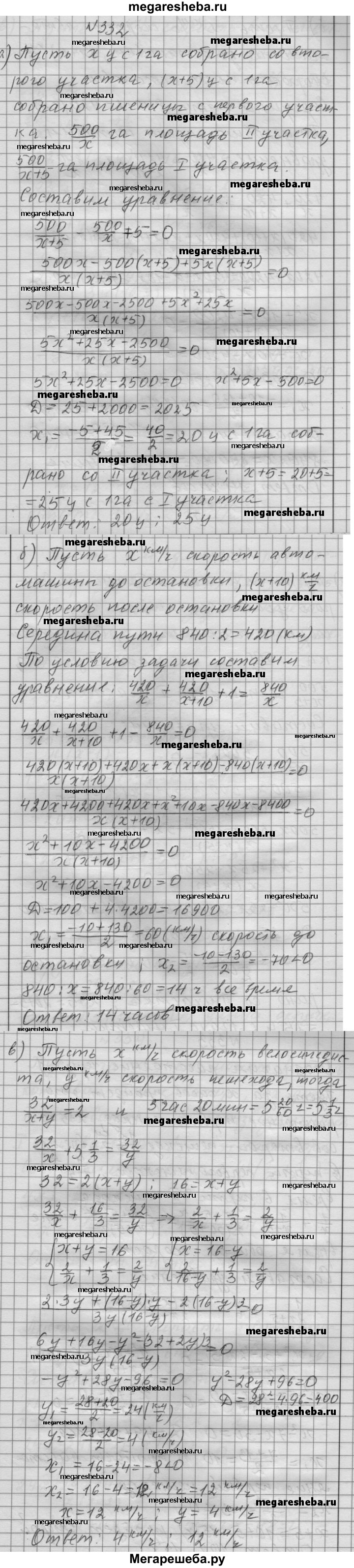 332. а) На уборке урожая с каждого из двух участков было собрано по 500 ц пшеницы. Площадь первого участка на 5 га меньше площади второго участка. Сколько центнеров пшеницы собрано с 1 га на каждом участке, если урожай пшеницы на первом участке с 1 га был на 5 ц больше, чем на втором? б) Автомашина должна была пройти 840 км. В середине пути водитель остановился на обед, а через час продолжил путь. Чтобы прибыть вовремя в пункт назначения, пришлось увеличить скорость на 10 км/ч. Сколько времени занял весь путь, включая время на остановку? в) Из пунктов А и В, расстояние между которыми 32 км, одновременно навстречу друг другу отправились пешеход и велосипедист. Через 2 ч они встретились. После встречи пешеход прибыл в пункт В на 5 ч 20 мин позже, чем велосипедист в пункт А. Найдите скорости пешехода и велосипедиста.