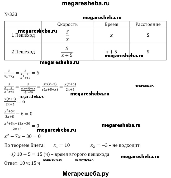 333. Первый пешеход может пройти расстояние между двумя пунктами на 5 ч быстрее, чем второй. Если пешеходы выйдут из этих пунктов одновременно навстречу друг другу, то встретятся через 6 ч. За сколько часов каждый из них может пройти это расстояние?