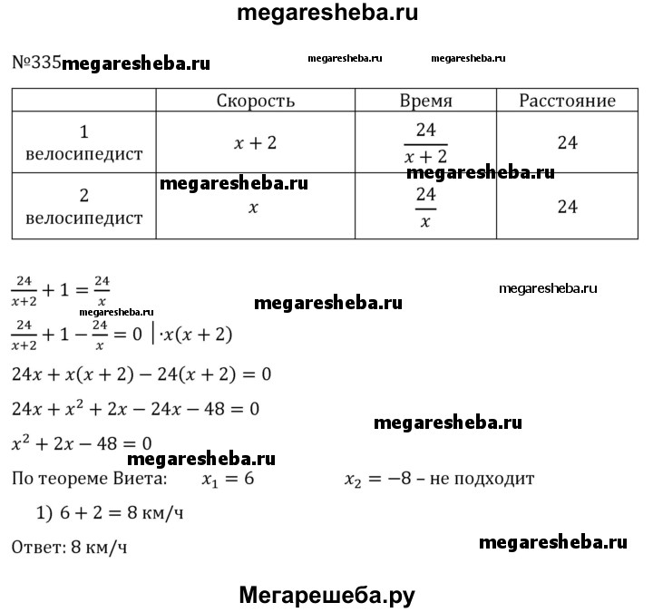 335. Два велосипедиста выехали одновременно навстречу друг другу из городов А и В. Первый проезжает в час на 2 км больше второго и приезжает в В на 1 ч раньше, чем второй в А. Расстояние от А до В 24 км. Определите скорость первого велосипедиста.