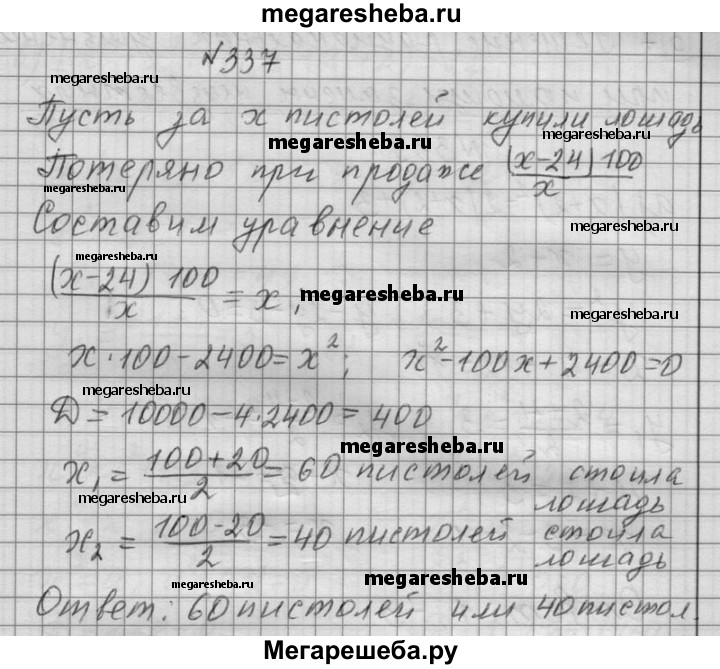 337. Задача Безу. Некто купил лошадь и спустя некоторое время продал её за 24 пистоля. При этой продаже он теряет столько процентов, сколько стоила ему лошадь. Спрашивается: за какую сумму он её купил??
