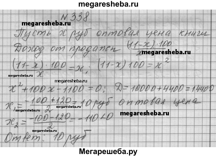 338. Торговец покупает книги по оптовой цене, а продаёт за 11 р. Он подсчитал, что доход от продажи одной книги в процентах равен оптовой цене книги в рублях. Какова оптовая цена книги?
