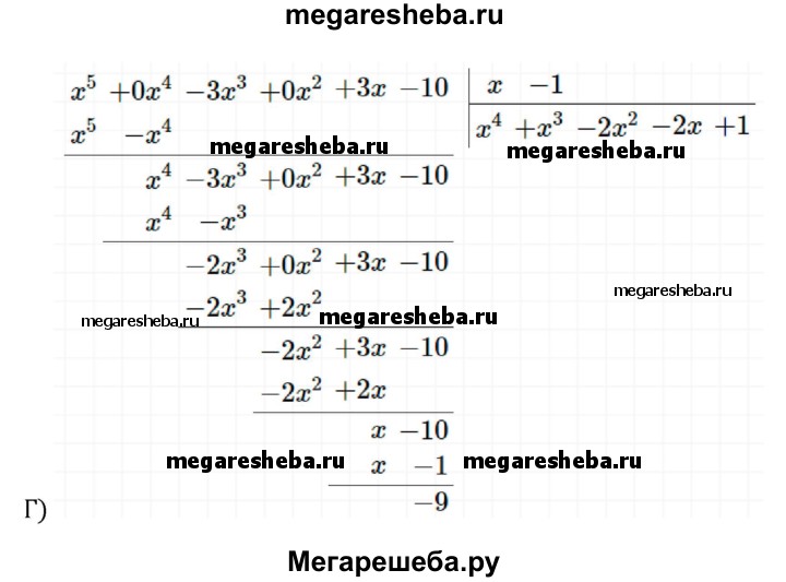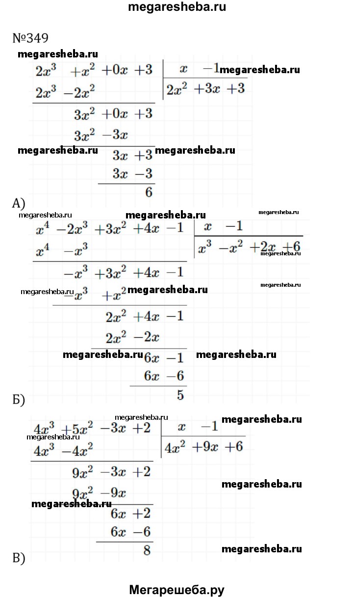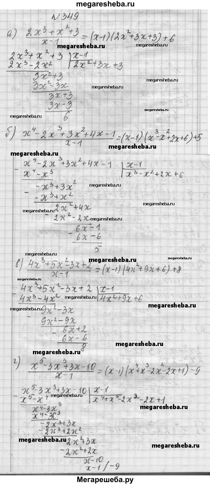 349. Разделите многочлен: а) 2х3 + х2 + 3; б) х4 - 2х3 + Зх2 + 4х - 1; в) 4л:3 + 5л:2 - Зх + 2; г) х5 - Зх3 + Зх – 10 на двучлен х - 1.