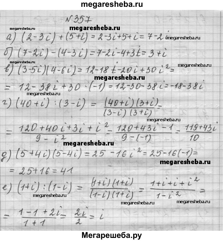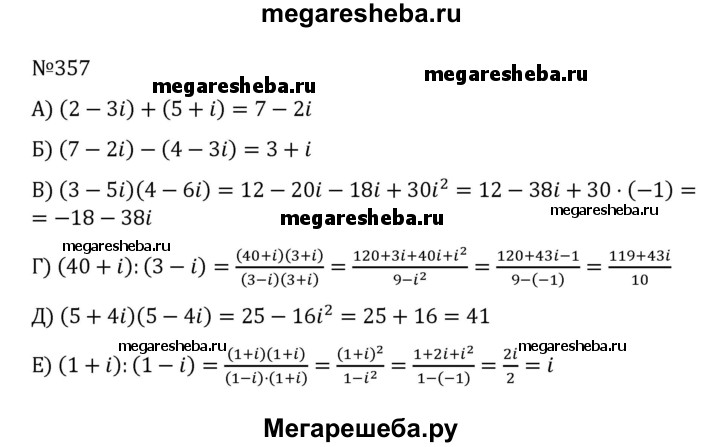 357. Выполните указанные действия: а) (2 - Зi) + (5 + i); б) (7 – 2i) - (4 - 3i); в) (3 – 5i)(4 – 6i); г) (40 + i) : (3 - i); д) (5 + 4i)(5 -4i); е) (1 + i) = (1 –i)