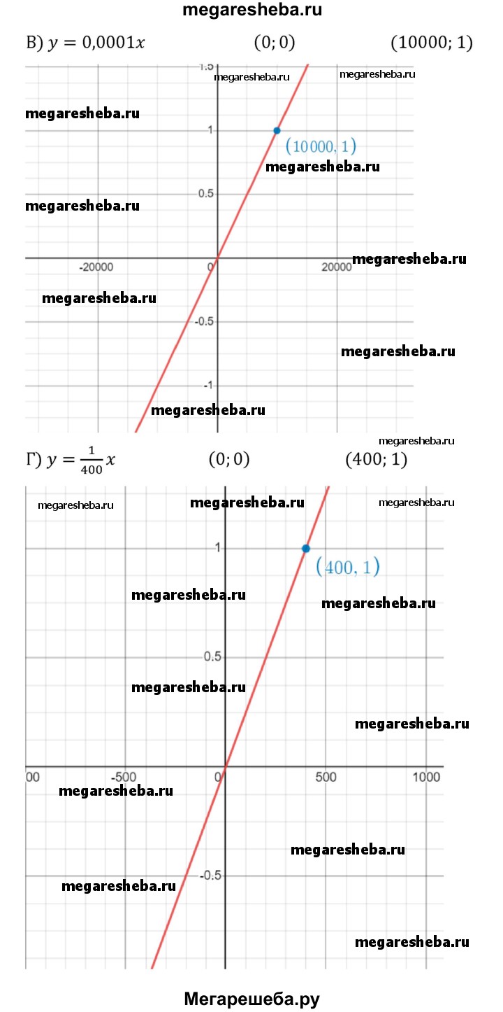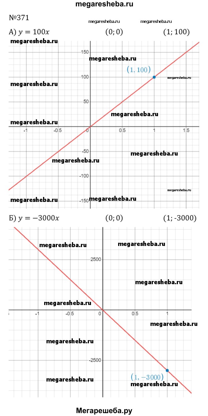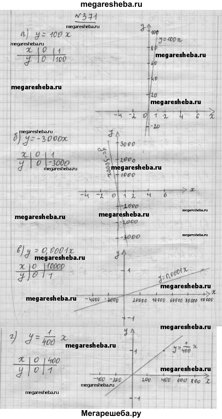 371. Постройте график функции: а) у = 100х; б) у = -З000х; в) у = 0,0001х; г) у = 1/400х Указание. Для удобства построения следует использовать различные единицы масштаба по осям координат.