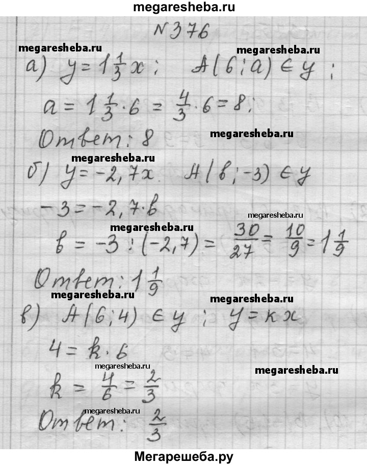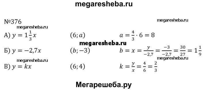 376. а) Задана функция у = 1*1/3х. Точка (6; а) принадлежит графику этой функции. Найдите а. б) Задана функция у = -2,7х. Точка (b; -3) принадлежит графику этой функции. Найдите b. в) Точка (6; 4) принадлежит графику функции у = kx. Найдите k.