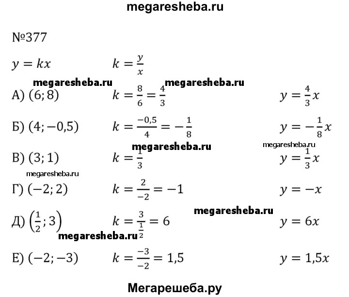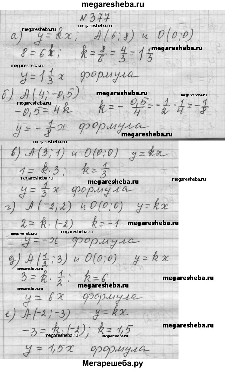 377. Какой формулой задана прямая, проходящая через начало координат и точку: а) (6; 8); б) (4; -0,5); в) (3; 1); г) (-2; 2); д) (1/2; 3) е) (-2; -3)?