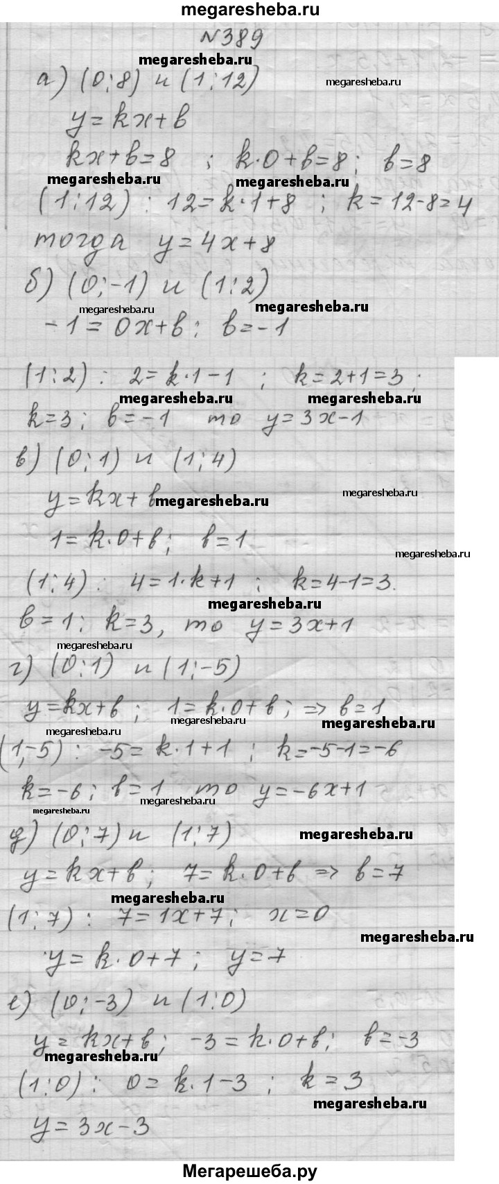 389. Какой формулой задана прямая, проходящая через точки: а) (0; 8) и (1; 12); б) (0; -1) и (1; 2); в) (0; 1) и (1; 4); г) (0; 1) и (1; -5); д) (0; 7) и (1; 7); е) (0; -3) и (1; 0)?