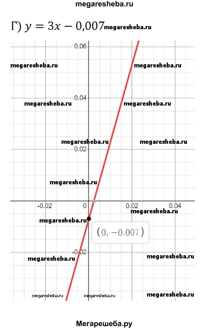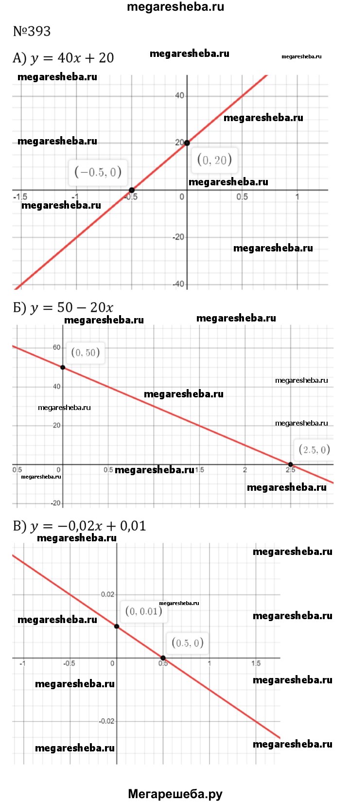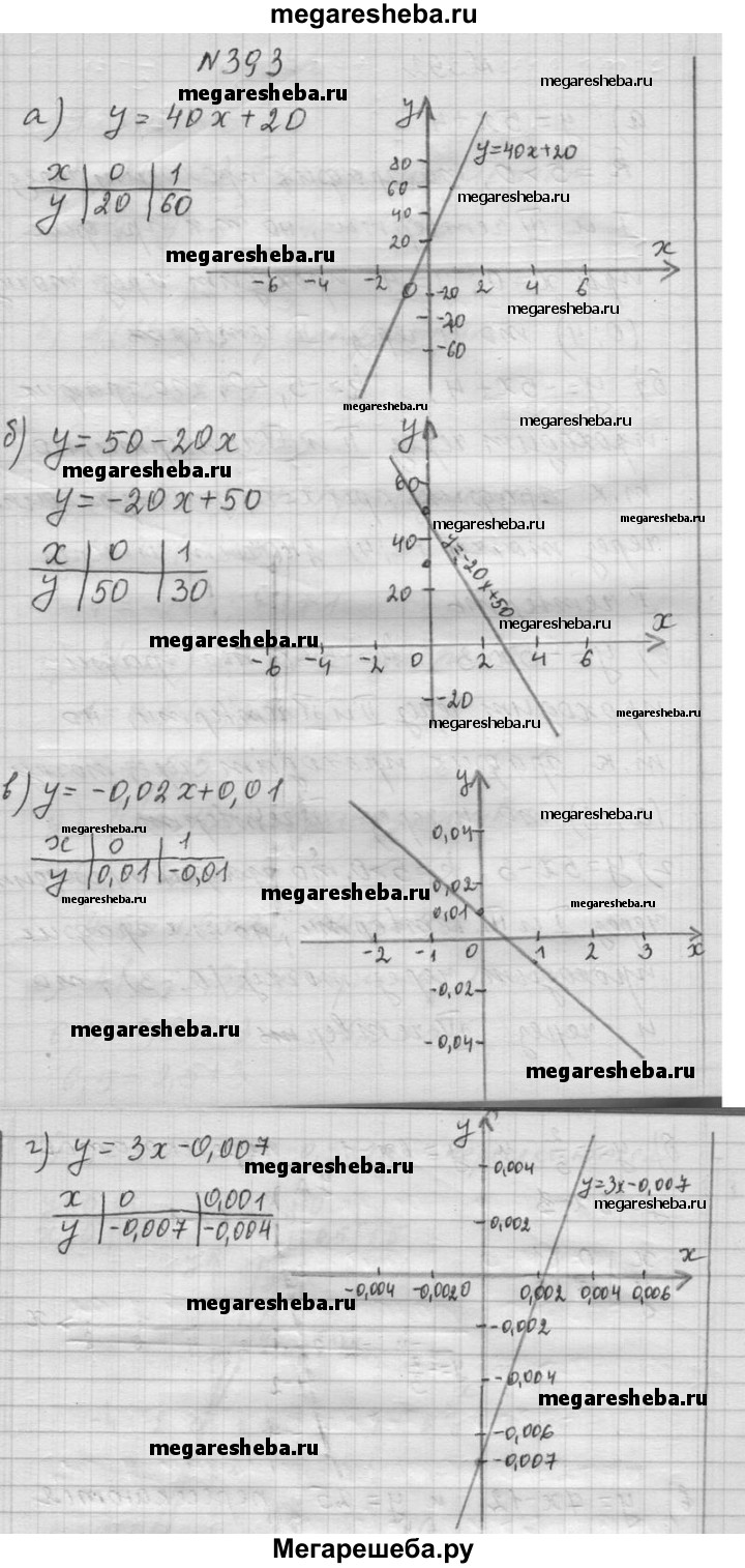 393. Постройте график функции: а) у = 40х + 20; б) у = 50 - 20х; в) у = -0,02х + 0,01; г) у = Зх - 0,007. Указание. Для удобства построения следует использовать различные единицы масштаба по осям координат.