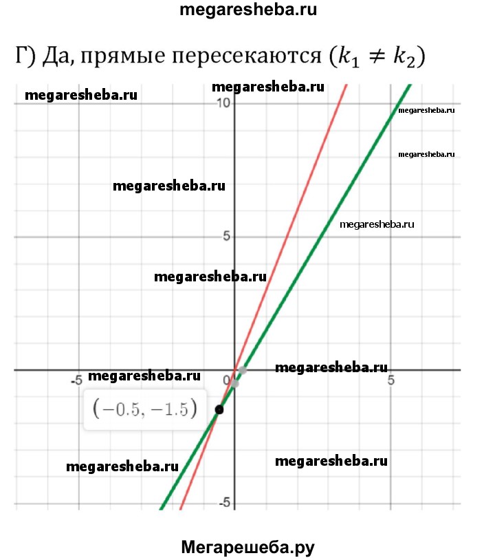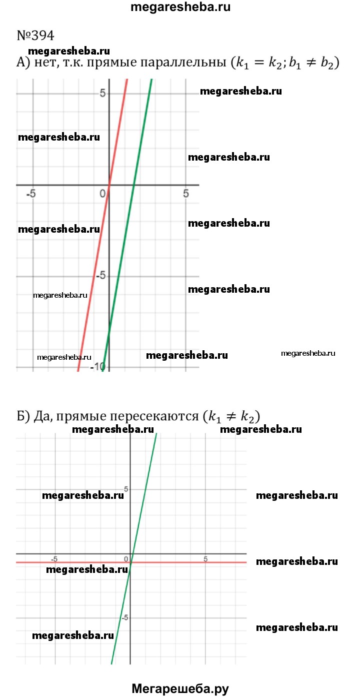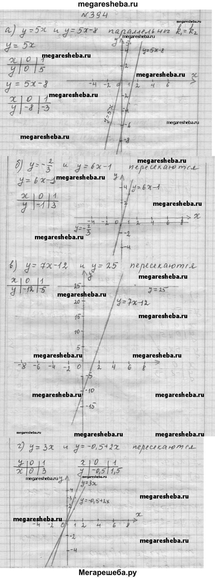 394. Определите без построения, пересекаются ли графики данных функций, а затем постройте их: а) у = 5х и у = 5х - 8; б) у = -2/3 и у = 6х - 1; в) у = 7х - 12 и у = 25; г) у = Зх и у = -0,5 + 2х.