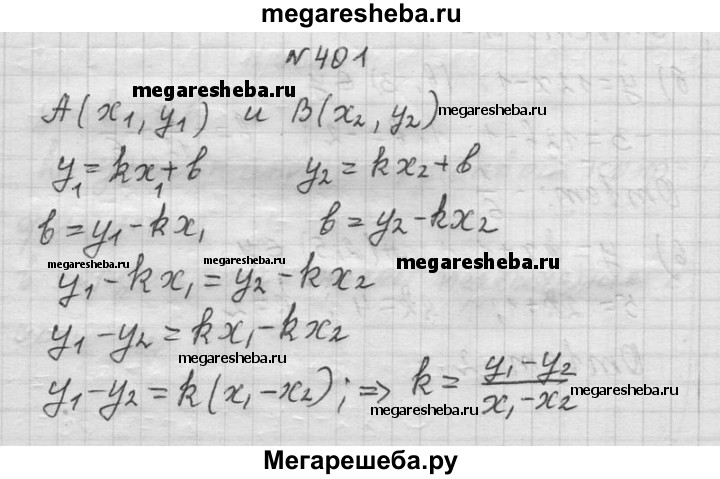 401. Точки А(x1; у1) и В(х2, у2) принадлежат графику функции у = kx + b. Выразите угловой коэффициент k через х1, х2, y1, у2, если известно, что х1 ≠ х2.