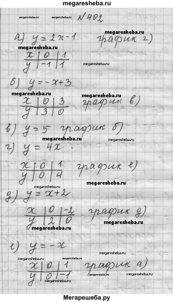 402. Какой из графиков, приведённых графиком функции: а) y = 2х-1; б) у =-х + 3; в) у = 5; г) у = 4х; д) у = х + 2; е) у = -х?