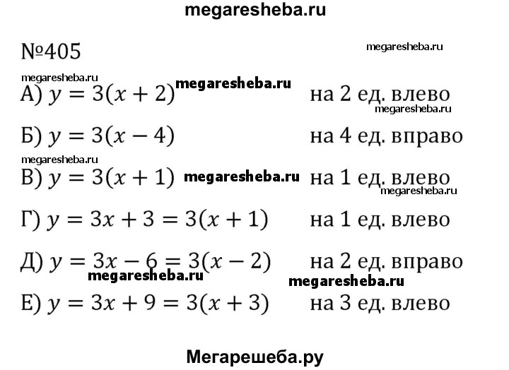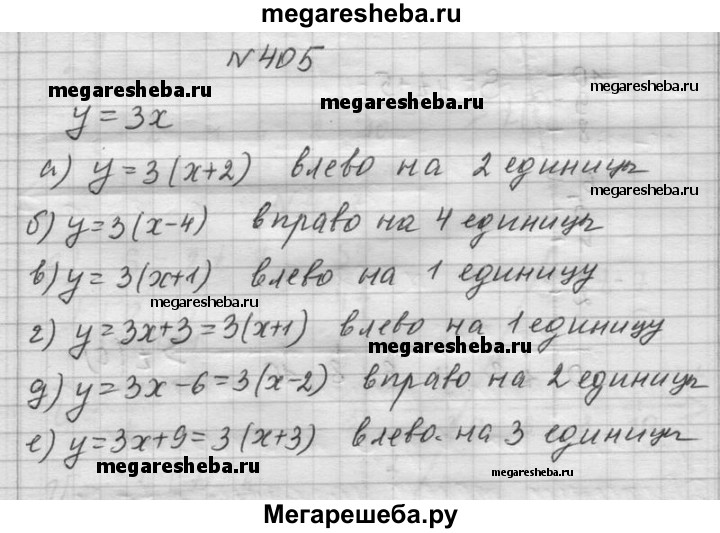 405. На сколько единиц вправо или влево нужно перенести график функции у = Зх, чтобы получить график функции: а) у = 3(х + 2); б) у = 3(х - 4); в) у = 3(х + 1); г) у = Зх + 3; д) у = Зх - 6; е) у = Зх + 9?