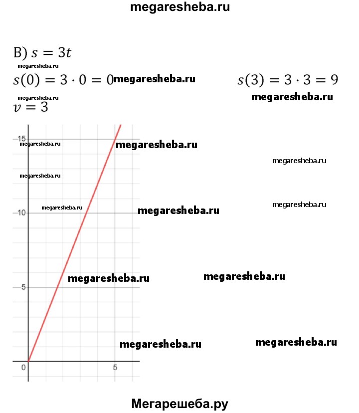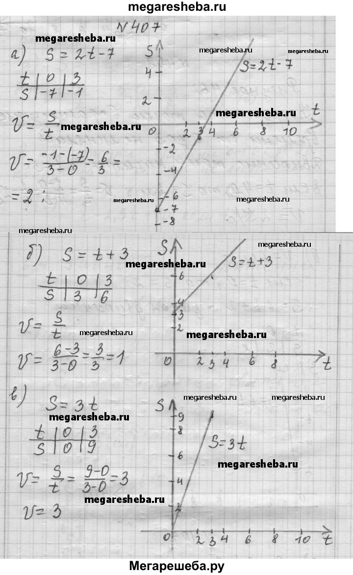 407. Дан закон движения точки вдоль оси s: a) s = 2t - 7; б) s = t + 3; в) s = 3t. Определите координату точки в момент времени t = 0, t = 3. Определите скорость точки. Постройте график движения.