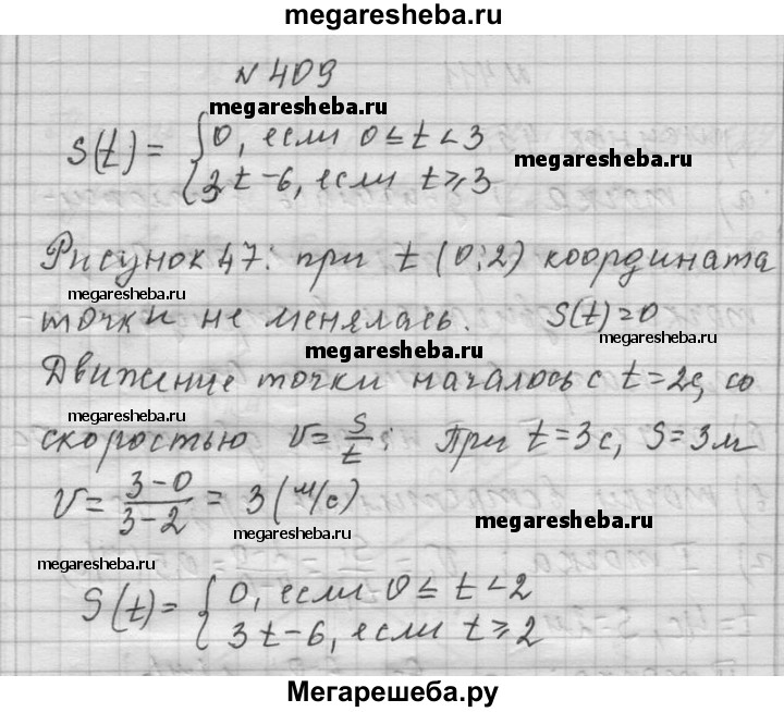 409. Функция, задающая зависимость координаты s от времени t, выражена формулой Ей соответствует график, изображённый на рисунке 46. Напишите формулу, которой задаётся функция s(t), график которой изображён на рисунке 47.