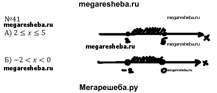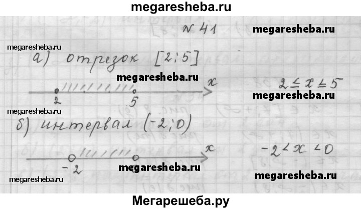41. Изобразите на координатной оси: а) отрезок [2; 5]; б) интервал (-2; 0). Запишите его с помощью двойного неравенства.