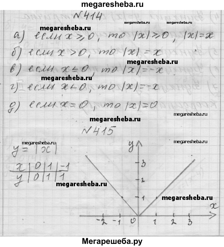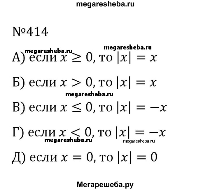 414. Упростите выражение |x| при условии: а) х ≥ 0; б) х > 0; в) х ≤ 0; г) х < 0; д) х = 0.