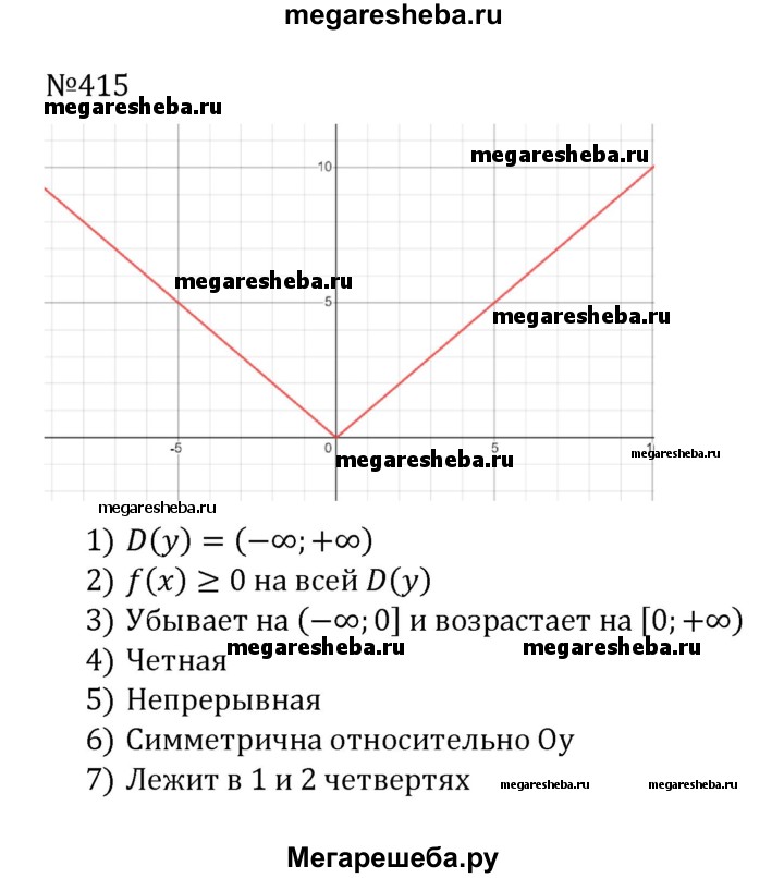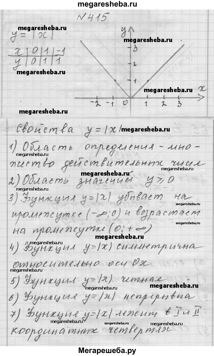 415. Постройте график функции у = |х| и сформулируйте свойства этой функции.