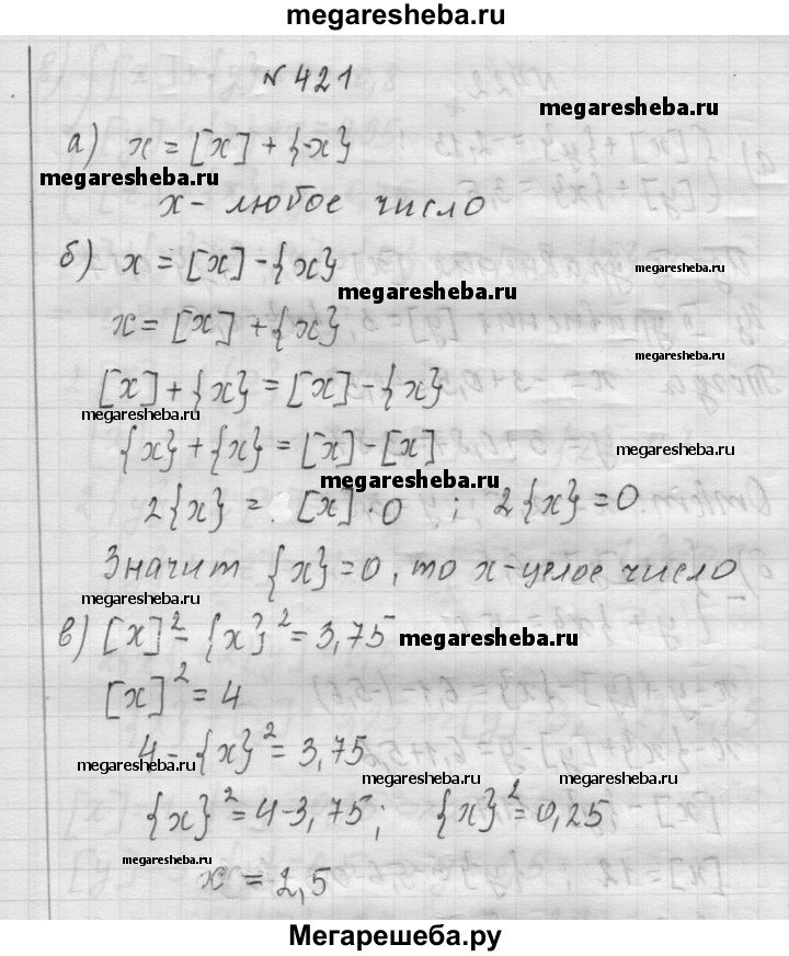 421. Решите уравнение: а) х = [х] + {х}; б) х = [х] - {х}; в) [х]2 - {х}3 = 3,75;