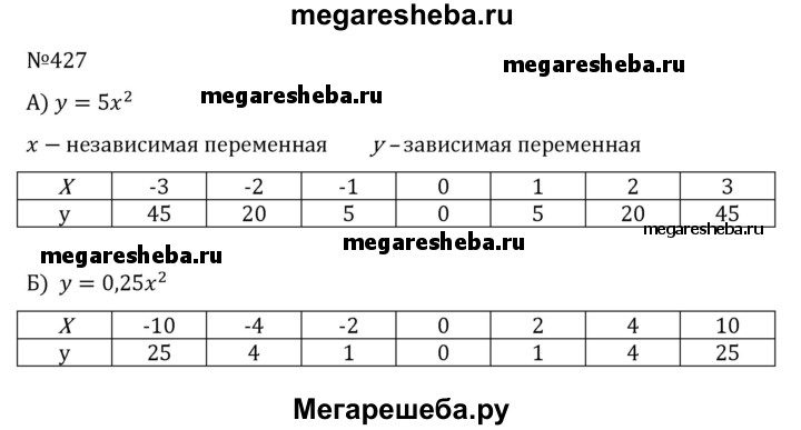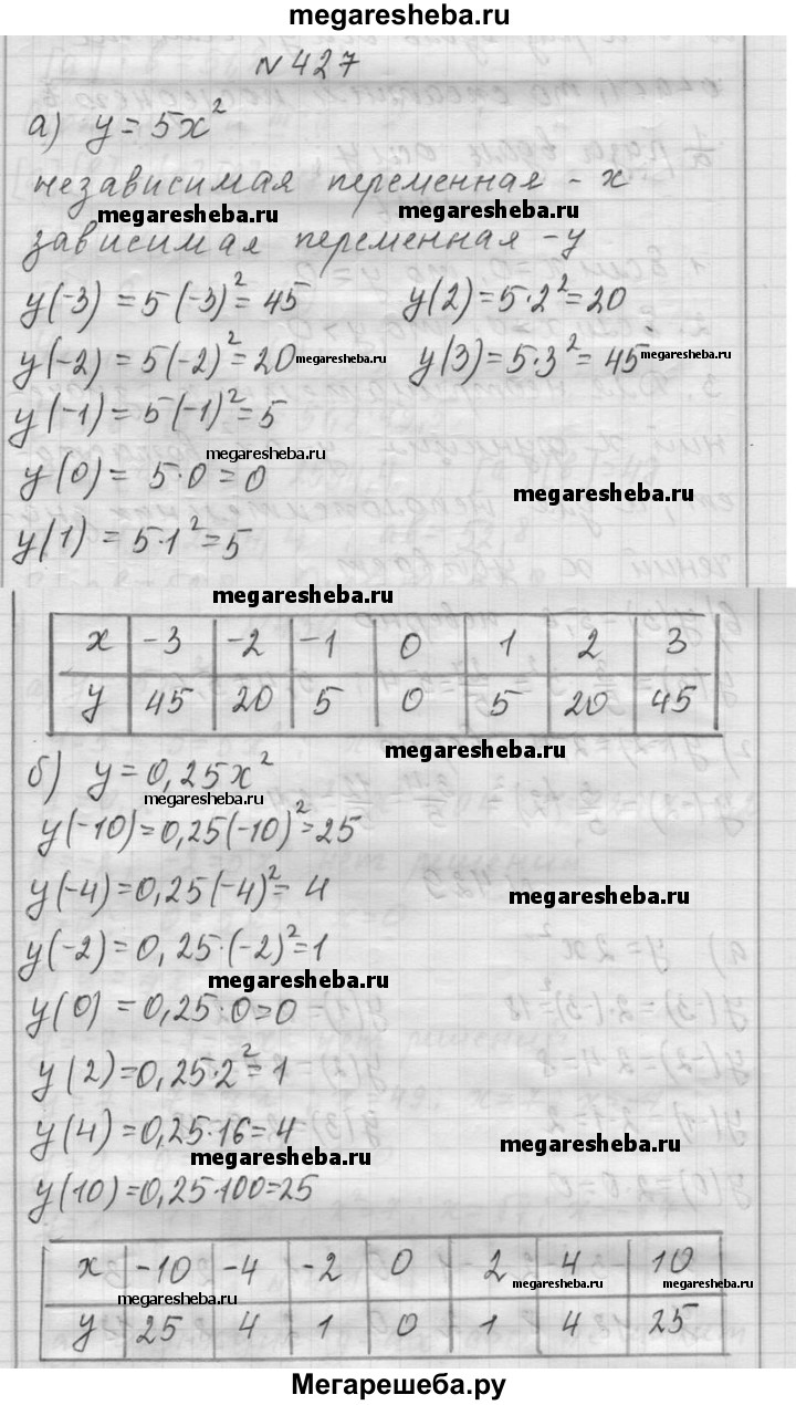 427. а) Функция задана формулой у = 5х2. Назовите зависимую и независимую переменные. Вычислите у(-3), у (-2), у(-1), y(0), у(1), у(2), y(3). Решение оформите в виде таблицы. Например: б) Функция задана формулой у = 0,25х2. Вычислите y (-10), у (-4), у(-2), г/(0), у (2), у (4), у (10). Решение оформите в виде таблицы.