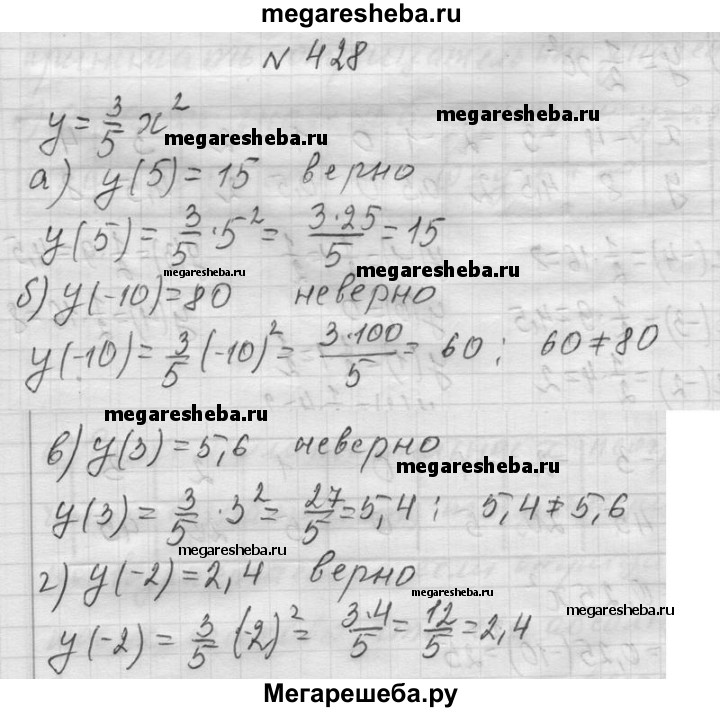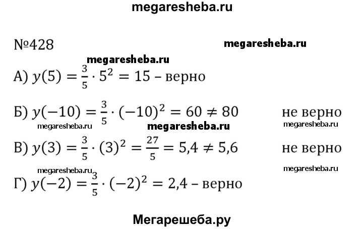 428. Функция задана формулой у = 35х2. Верно ли равенство: а) y(5) = 15; б) у(-10) = 80; в) y(3) = 5,6; г) у(-2) = 2,4?