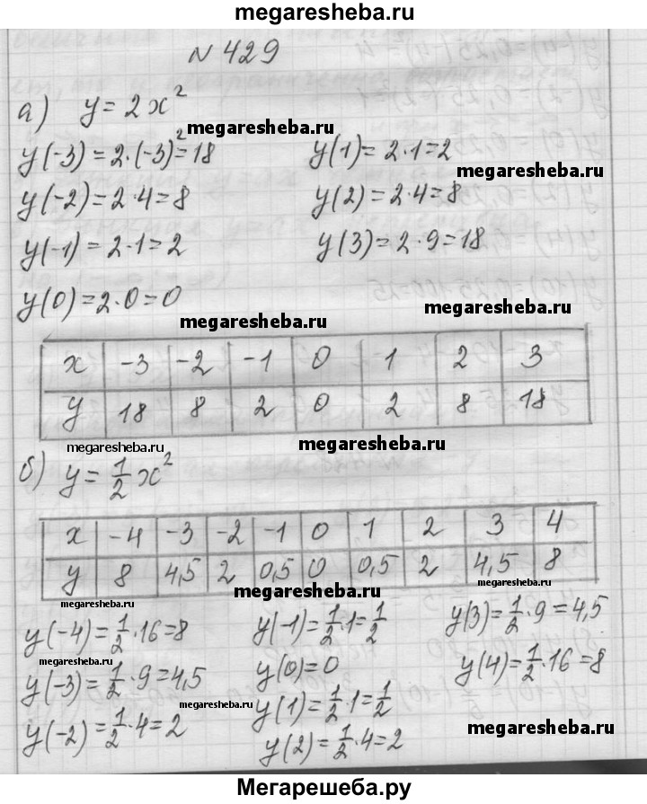429. а) Вычислите значения функции у = 2х2 для значений х от -3 до 3 через 1. Решение оформите в виде таблицы. б) Вычислите значения функции у = 1/2х2 для значений х от -4 до 4 через 1. Решение оформите в виде таблицы.