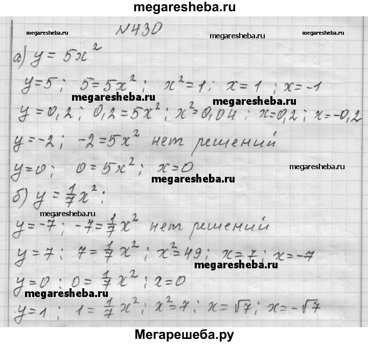 430. а) Дана функция у = 5x2. При каких х значение функции равно: 5; 0,2; -2; 0? б) Дана функция у = 1/7x2. При каких х значение функции равно: -7; 7; 0; 1?