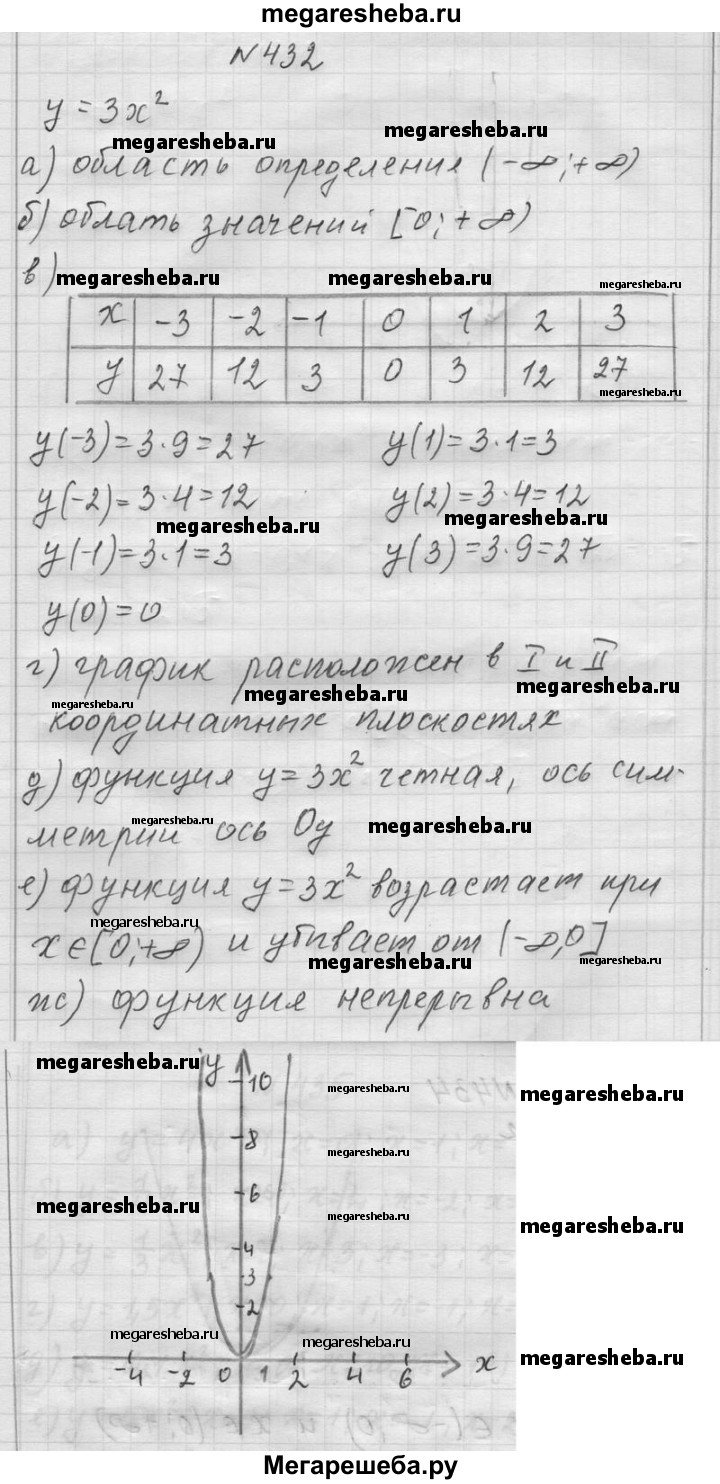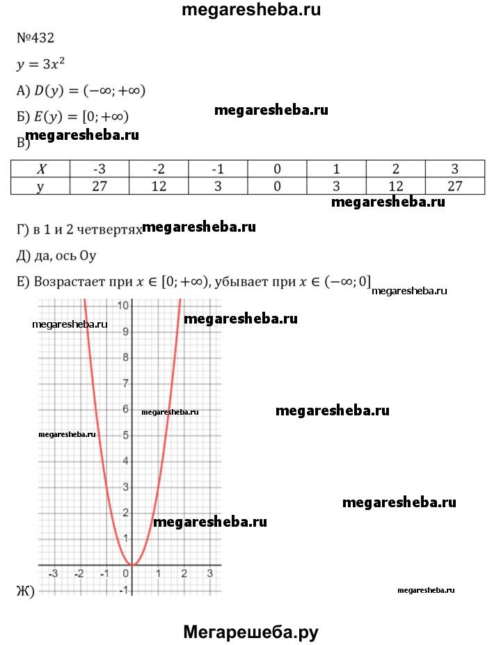 432. Задана функция у = Зх2. а) Какова область определения этой функции? б) Какова область значений этой функции? в) Вычислите значение функции при х, равном -3, -2, -1, 0, 1, 2, 3. Решение оформите в виде таблицы. г) В каких четвертях расположен график данной функции? д) Является ли данная функция чётной? Если да, то укажите ось симметрии её графика. е) На каком промежутке эта функция возрастает? убывает? ж) Постройте график функции у = Зх2, учитывая её непрерывность.