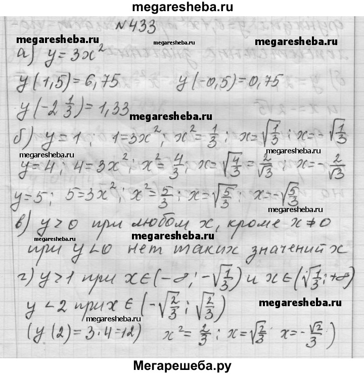 433. С помощью графика функции у = Зх2 (№ 432) определите: а) y(1,5), y(-2*1/3), y(-0,5); б) при каких значениях х верно равенство: у = 1; у = 4; у = 5; в)при каких значениях х верно неравенство: у > 0; у < 0; г) при каких значениях х верно неравенство: у > 1; у < 2.
